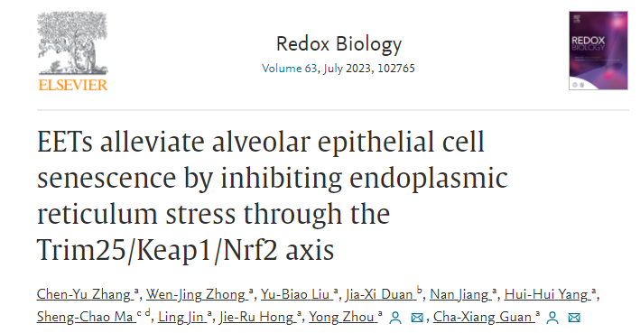 2023年6月2日,肉漫屋 基础医学院管茶香教授团队在国际权威学术期刊《氧化还原生物学》(Redox biology,中科院一区TOP期刊)发表了题为“EETs alleviate alveolar epithelial cell senescence by inhibiting endoplasmic reticulum stress through the Trim25/Keap1/Nrf2 axis(EETs通过Trim25/Keap1/Nrf2轴抑制内质网应激减缓肺泡上皮细胞衰老)”的研究论文。肉漫屋 基础医学院生理学系为第一及通讯作者单位,基础医学院管茶香教授和周勇副教授为本文的共同通讯作者,2020级博士生张晨宇为第一作者。