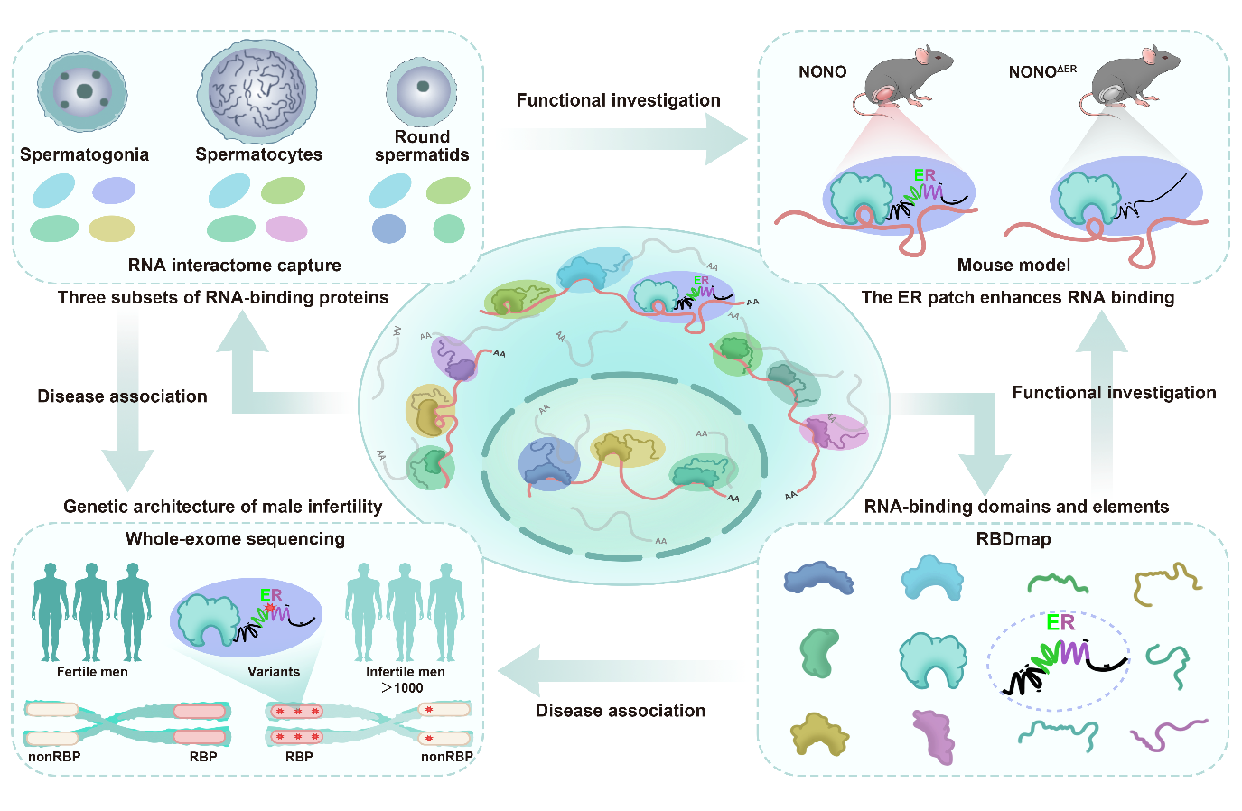图:本研究的4个主要研究内容及4大创新点小结(小鼠精子发生 RBP图谱、小鼠RBP在精子发生过程中的多层次动态性、RNA结合结构域和非结构域元件新发现、RBP在男性不育人群的临床应用前景)