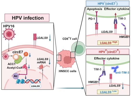 该团队通过整合HNSCC患者临床样本,结合细胞和动物实验,发现circE7可下调LGALS9基因(编码Galectin-9蛋白),抑制杀伤性T细胞功能进而促进肿瘤免疫逃逸。进一步分析发现Galectin-9通过竞争性结合T细胞表面的TIM-3,促进CD8+T细胞分泌杀伤性细胞因子,Galectin-9还可以结合T细胞表面PD-1抑制T细胞凋亡;circE7下调Galectin-9,导致CD8+T功能和活性受到抑制;而circE7下调LGALS9表达的具体分子机制是circE7结合并抑制乙酰辅酶A羧化酶1 (acetyl-CoA carboxylase 1, ACC1)的磷酸化和激活,降低细胞内乙酰辅酶A水平,导致LGALS9启动子区域H3K27乙酰化水平降低,通过表观遗传调控抑制LGALS9的表达;最后通过体内外模型证实联合使用TIM-3与PD-1单克隆抗体能显著提高HNSCC的免疫治疗效果。该研究拓展了HPV在头颈鳞癌发病机制,特别是免疫逃逸分子机制的理解,并为头颈鳞癌的免疫治疗提供了新的靶点和潜在治疗方案。