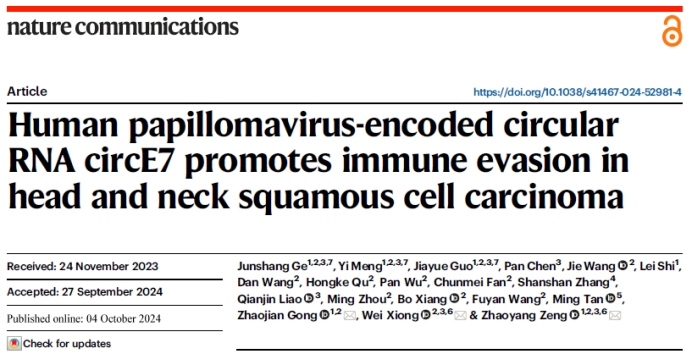 近日,肉漫屋 基础医学院肿瘤研究所曾朝阳、熊炜联合湘雅二医院口腔医学中心龚朝建在Nature Communications杂志发表了题为“Human papillomavirus-encoded circular RNA circE7 promotes immune evasion in head and neck squamous cell carcinoma”(人乳头瘤病毒编码的环状RNA circE7促进头颈鳞癌免疫逃逸)的研究论文。该研究发现人乳头瘤病毒(Human papillomavirus, HPV)通过编码环状RNA circE7,下调免疫检查点分子Galectin-9的表达,促进头颈部鳞状细胞癌(head and neck squamous cell carcinoma, HNSCC)免疫逃逸的新机制,并基于该发现提出了TIM-3 (Galectin-9在T细胞上的受体)单抗与现有PD-1单抗联合使用提高头颈鳞癌免疫治疗效果的新思路。