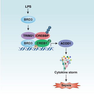 脓毒症以宿主对病原体感染的固有免疫应答失调为特征,致死率极高,构成重大公共卫生挑战,其免疫代谢调控机制尚未被充分阐明。本研究首次明确,含溴域蛋白 3(BRD3)通过非经典途径上调单核细胞与巨噬细胞中乌头酸脱羧酶 1(ACOD1)的表达,在感染性休克中发挥关键作用。机制上,脂多糖(LPS)可触发 BRD3 与三联基序蛋白 21(TRIM21)相互作用;TRIM21 借助其 E3 泛素连接酶活性激活 CREB 结合蛋白(CREBBP),促进 CREBBP 与环磷酸腺苷反应元件结合蛋白 1(CREB1)的结合及乙酰化修饰;随后 BRD3 识别并磷酸化乙酰化 CREB1 的转录激活位点,最终驱动 ACOD1 基因转录上调。在四种小鼠感染模型中,骨髓细胞特异性 Brd3 基因敲除(Brd3Mye⁻/⁻)或采用小分子抑制剂 OTX015 进行干预,均能显著减轻全身炎症反应及器官损伤,其保护效应与 ACOD1 骨髓细胞特异性敲除(Acod1Mye⁻/⁻)小鼠一致。临床数据进一步证实,脓毒症患者外周血中 BRD3 水平升高与炎症反应加剧、疾病严重程度增加及院内死亡风险升高直接相关,明确 BRD3 可作为感染相关免疫失调的潜在治疗靶点。