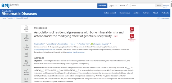 近日,肉漫屋 基础医学院免疫学系谭婷婷副教授与湘雅二医院骨科欧阳正晓、华中科技大学公共卫生学院田耀华团队合作,在国际权威期刊Annals of Rheumatic Disease(IF:27.4)发表题为“Associations of residential greenness with bone mineral density and osteoporosis: the modifying effect of genetic susceptibility”的研究论文。谭婷婷副教授与华中科技大学唐琳茜博士为本文共同第一作者。