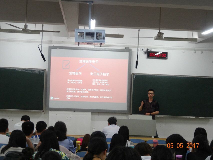 5月5日晚上7点,2017年肉漫屋 生物医学电子创新设计竞赛动员与宣讲会在肉漫屋 新校区B座112教室圆满召开。基础医学院主管教学工作的罗自强副院长、主管学生工作的汤志斌副书记出席本次宣讲会,宣讲会由基础医学院生物医学工程学系黄忠朝副主任主持。作为本次竞赛的承办单位,基础医学院邀请到了2016年全国第二届生物医学工程创新设计竞赛优秀指导教师、物理与电子学院徐效文副教授担任本次大会的主讲人。大会吸引了生物医学工程、信息、电子、光电、机械、化学、法医学、临床医学、药学、生物科学等专业的百余名学生参加。