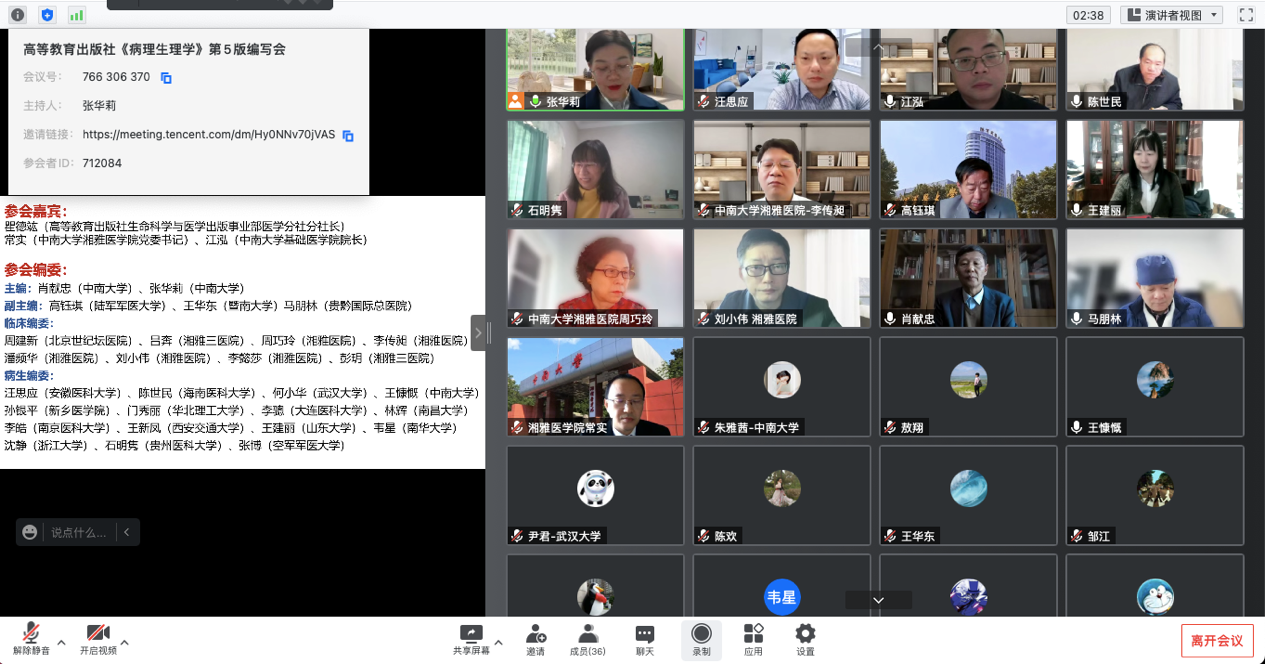 “十二五”普通高等教育本科国家级规划教材、高等学校“十四五”医学规划新形态教材《病理生理学》(第5版)编写会于2023年1月8日线上顺利召开。该教材由肉漫屋 基础医学院肖献忠教授和张华莉教授担任主编,陆军军医大学高钰琪教授、暨南大学王华东教授、贵黔国际总医院马朋林教授担任副主编。高等教育出版社生命科学与医学出版事业部医学分社分社长瞿德竑责任编辑以及28位编委(包括9名临床编委)出席会议。