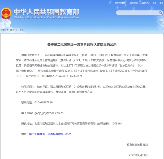 4月11日,教育部公示了第二批国家级一流本科课程认定结果。我院新增2门国家级一流本科课程,分别是潘爱华教授领衔的《局部解剖学》和蔡继峰教授领衔的《医疗纠纷的防范与处理》。自2020年11月教育部公布首批国家级一流本科课程认定结果以来,我院被认定国家级一流本科课程共计6门。