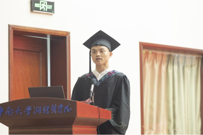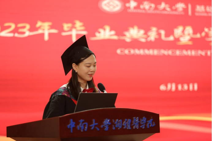 本科生代表王观明、研究生代表钟文静先后发言。王观明同学动情地说到,身为中南人,我们也许各奔天涯,追求科研的未知、投身教育的热忱、服务医疗卫生的使命;但无论前方何景,我们都将矢志不渝地承担身为湘雅人的责任和使命,秉承“公勇勤慎”的本色,“诚爱谦廉”的品格:“求真求确、必邃必专”的精神!博士毕业生代表钟文静表示,在中南硕博七年收获颇多,一路以来,有传道授业的老师为自己指引学术之路,有志同道合的伙伴共同挥洒青春热血;中南教给我们,真正有意义的事情,都不是轻轻松松就能完成的。我们如果没有背负压力前行,则永远不知道自己的潜力在哪里;她始终相信力行“向善、求真、唯美、有容”,终将迎来美好的未来。
