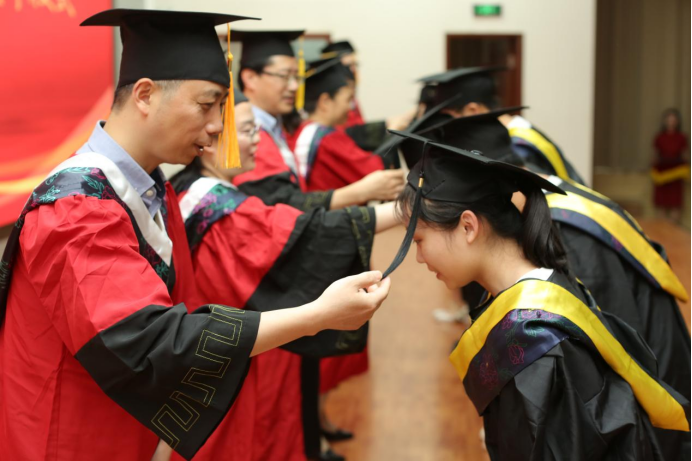 王慷慨副院长宣读学校学位评定委员会决议:66人获学士学位,90人获硕士学位,38人获博士学位。院领导和导师代表为获得学位的毕业生代表正冠拨穗,颁发学位证书。