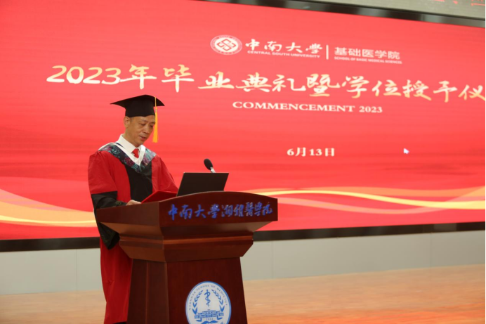 6月13日下午3点,基础医学院2023年毕业典礼暨学位授予仪式在湘雅新校区图书馆学术报告厅隆重举行。学院导师代表、2023年全体毕业生以及毕业生亲友200余人共同到场见证仪式举行。院领导李顺长、管茶香、刘谭明、王慷慨、殷刚、熊炜、刘俊文、黄河出席,院党委书记李顺长主持典礼。