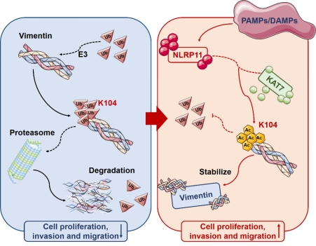 这一研究揭示了炎症小体组分核苷酸结合寡聚化结构域NOD样受体蛋白11(NLRP11)通过招募乙酰化酶KAT7与Vimentin结合,介导Vimentin K104乙酰化进而稳定其在早期肺腺癌(LUAD)细胞中表达的重要机制(图2),为衔接炎症与EMT在肿瘤发生发展中的关系提供新的证据。