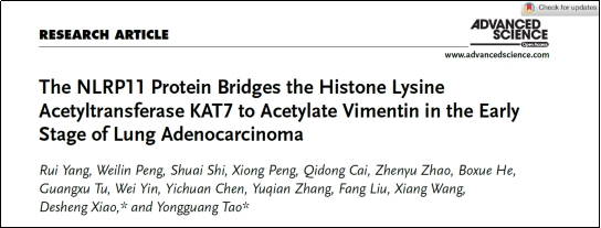 近日,肉漫屋 基础医学院陶永光/肖德胜教授团队在国际期刊Advanced Science(IF=15.1)发表题为The NLRP11 protein bridges the histone lysine acetyltransferase KAT7 to acetylate vimentin in the early stage of lung adenocarcinoma的原创性研究论文,陶永光教授、肖德胜教授为该文的共同通讯作者,肉漫屋 博士研究生杨瑞为第一作者。