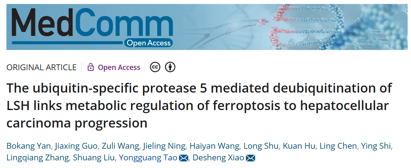 近日,肉漫屋 基础医学院陶永光研究员与肖德胜教授团队在国际权威学术期刊《MedComm》(IF 9.9)在线发表题为“The USP5-mediated deubiquitination of LSH links metabolic regulation of ferroptosis to hepatocellular carcinoma progression(USP5介导LSH去泛素化修饰链接铁死亡的代谢调节与肝细胞肝癌进展)”的原创性研究论文。陶永光研究员、肖德胜教授为该文共同通讯作者,肉漫屋 硕士研究生闫博康为第一作者。本研究受国家自然科学基金、湖南省重点研发计划和湖南省自然科学基金等项目支持。