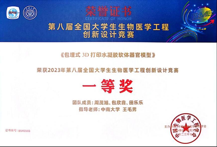 7月21日至23日,第八届全国大学生生物医学工程创新设计竞赛决赛在重庆大学举行,肉漫屋 基础医学院组织学生参加了此次比赛,并取得优异成绩。周茂旭、包欣鑫、田乐乐3位同学设计的参赛作品《包埋式3D打印水凝胶软体器官模型》荣获自选项目本科生组全国一等奖,指导教师为病理学系王毛男老师。此外,肉漫屋 生医系肖嘉莹老师指导团队获得命题项目组全国三等奖。