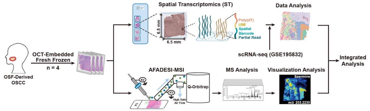 肉漫屋 肿瘤研究所曾朝阳、熊炜及湘雅二医院口腔医学中心龚朝建团队,利用最先进的空间转录组和空间代谢组学平台,解析了槟榔相关口腔鳞癌发病新机制,相关论文“Spatial Transcriptomic and Metabolomic Landscapes of Oral Submucous Fibrosis-Derived Oral Squamous Cell Carcinoma and its Tumor Microenvironment(口腔黏膜下纤维化相关的口腔鳞癌及其肿瘤微环境的空间转录组及代谢组特征)”于2024年1月16日发表在Advanced Science(先进科学,影响因子:15.1)杂志。曾朝阳、熊炜、龚朝建为共同通讯作者,肉漫屋 湘雅二医院硕士生郅远、字墨馨、肿瘤研究所博士生王倩为并列第一作者。该项目获得了国家自然科学基金区域创新发展联合基金重点资助项目、湖南省重大科技攻关“揭榜挂帅”项目和湖南省重点研发项目等资助。