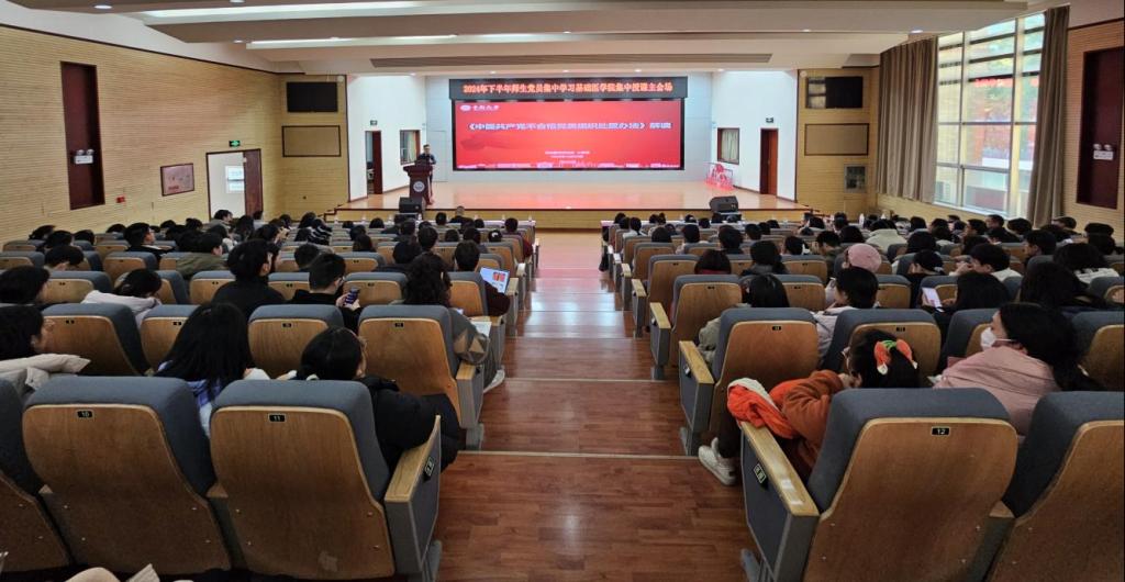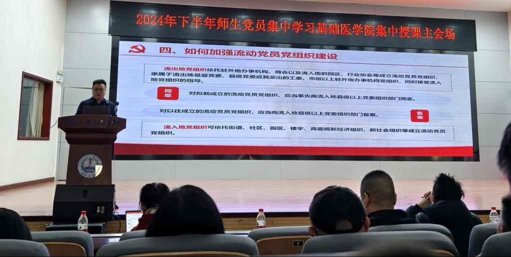为落实《2024年肉漫屋 师生党员集中学习教学计划》,提升党员政治素质,增强基层党组织战斗力和凝聚力,12月25日下午,基础医学院党委书记王慷慨同志为全院师生党员集中授课,解读《中国共产党不合格党员组织处置办法》和《关于进一步加强和改进流动党员管理工作的意见》,全院500余位党员(含退休党员)在4个会场,线上线下同步参加学习。