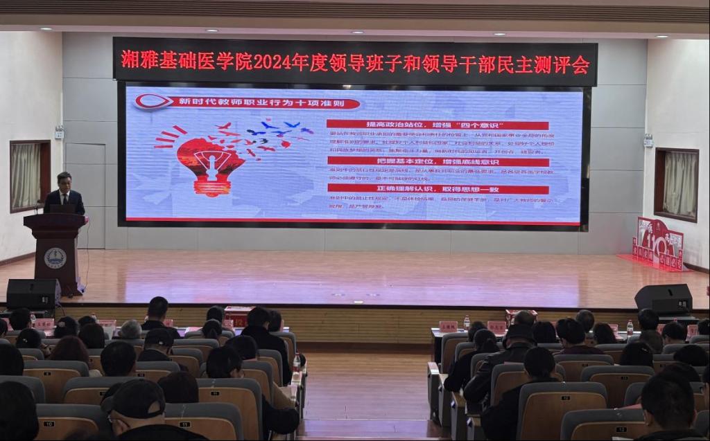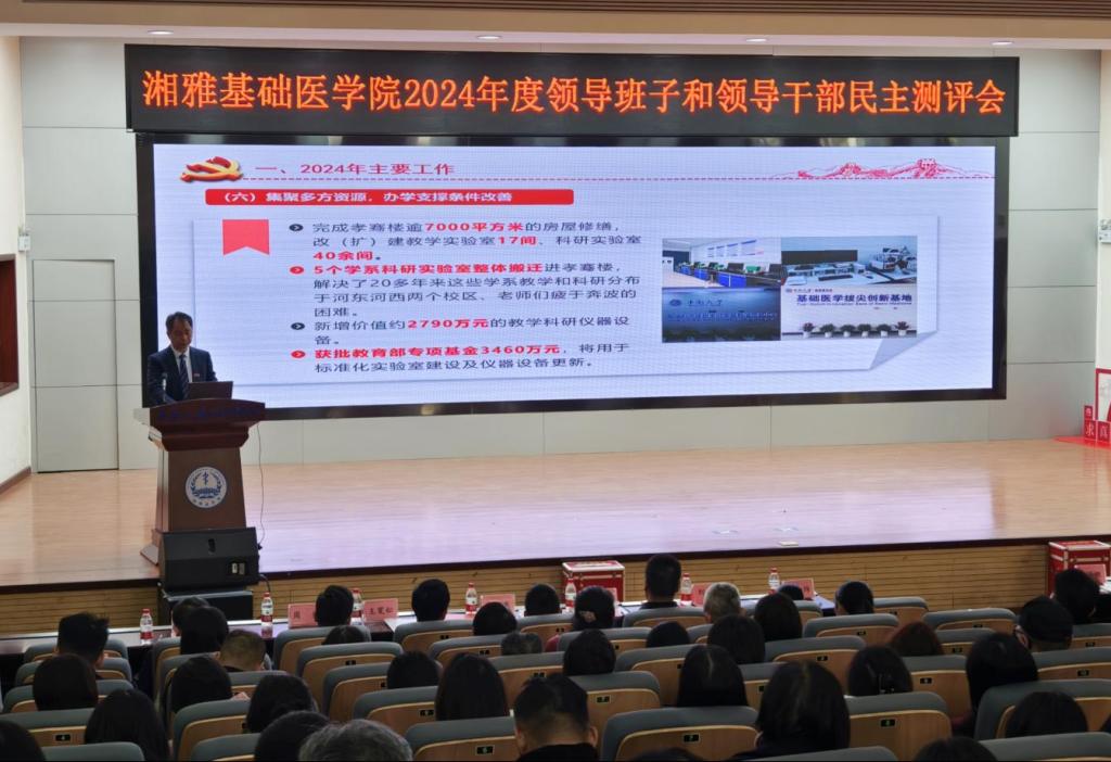 熊炜院长代表学院领导班子作2024年度述职报告。他指出,2024年是中华人民共和国成立75周年,也是湘雅医学办学110周年,在这一年,学院正式更名为“肉漫屋 ”;在这一年,学院坚持以习近平新时代中国特色社会主义思想为指导,深入学习贯彻党的二十大和二十届二中、三中全会精神,全面落实立德树人根本任务,在学校党政的坚强领导下,推动党的建设、学生思政、人才培养、科研创新、师资队伍、办学条件、合作交流、校园安全等各方面均取得较好成绩。新的一年,学院要深入落实学校“四个转型”发展战略和“三步走”战略目标,把牢政治方面、提升学科内涵、创新培养体系、厚植人才优势、加强科研布局、坚守底线思维,为奋力建设具有湘雅特色的国内一流基础医学院而继续团结奋斗。