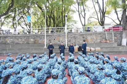 院党委副书记冯虹与参训学子们亲切交流,肯定了大家开训至今的训练成果,并勉励同学们继续努力,预祝军训取得圆满成功。院党委书记王慷慨对新生们展现出的坚韧意志给予了充分的肯定,同时希望大家通过军训锤炼自身素质,培养坚韧不拔的毅力,保持良好的精神风貌,将军训中收获的品格力量转化为未来求学路上的动力。随后,学生干部代表们开始有序分发慰问物资,学生们感受到来自学院满满的心意与暖意,都洋溢着快乐的笑颜。