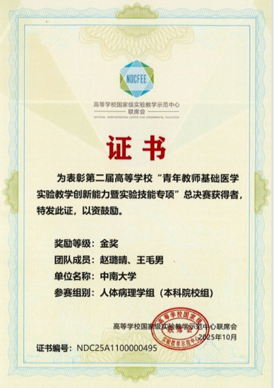 在本次赛事中,肉漫屋 病理学系青年教师赵璐晴、王毛男团队代表学校参赛,在湘雅病理教学团队和教学主任胡永斌教授的精心指导下,凭借扎实的专业素养、精湛的实验技能和创新的教学设计,在众多参赛队伍中脱颖而出,荣获人体病理学组金奖。该团队在比赛中以高质量的教学展示、生动的课堂设计及科学严谨的实验操作,充分展现了湘雅教师的教学风采与创新能力,赢得了专家评委的一致好评。