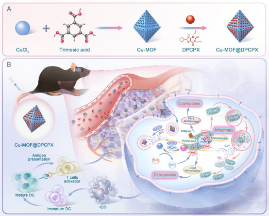 研究团队创新性地采用铜基金属有机框架(MOF-199)与化疗药物 DPCPX联合,通过一锅共生法成功制备出新型纳米药物材料 Cu-MOF@DPCPX。该纳米系统不仅具有精准靶向肿瘤受体 ADORA1 的能力,还具备卓越的 pH 响应性。Cu-MOF@DPCPX可在酸性肿瘤微环境中实现智能降解与铜离子的可控释放,从而多维度破坏癌细胞的生命链条:其一,驱动线粒体脂酰化酶聚集诱导典型的铜死亡(cuproptosis);其二,促进 Fenton-like 反应生成大量羟基自由基激活铁死亡(ferroptosis);其三,触发持续性线粒体损伤并诱导线粒体自噬(mitophagy);最终,通过三重细胞死亡通路的协同放大,Cu-MOF@DPCPX 可导致肿瘤细胞全面崩解,并释放大量损伤相关分子模式(DAMPs),诱导免疫原性细胞死亡(ICD),实现肿瘤的深度杀伤。本研究不仅提出了以铜离子为核心驱动的“三通路联动”细胞程序性死亡的新策略,也首次证实了在铜死亡、铁死亡与线粒体自噬之间存在可循环放大的串联互作机制。