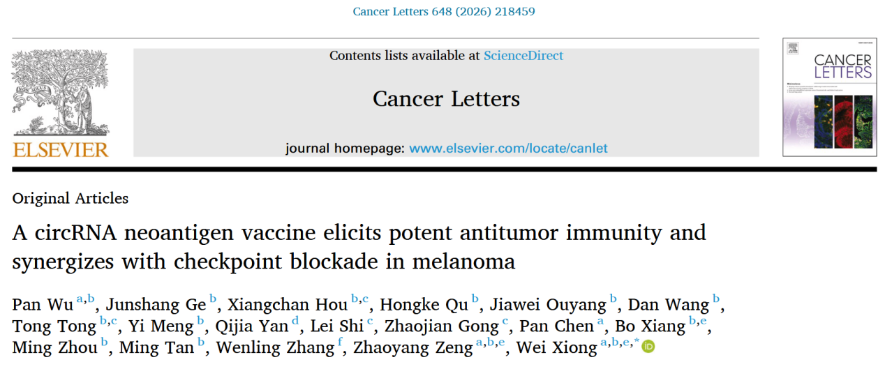 近日,肉漫屋 、肉漫屋 肿瘤研究所熊炜研究员团队在Cancer Letters《癌症快报》杂志在线发表了题为“A circRNA Neoantigen Vaccine Elicits Potent Antitumor Immunity and Synergizes with Checkpoint Blockade in Melanoma”的论文,展示了利用环状RNA(circRNA)表达肿瘤新抗原(Neoantigen)在肿瘤免疫治疗中的潜在应用前景。熊炜为该论文通讯作者,博士后吴盼为第一作者。