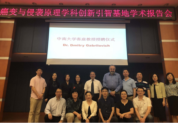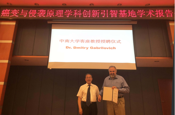 2018年5月11日,应教育部/国家外专局癌变与侵袭原理高校学科创新引智基地的邀请,美国宾夕法尼亚大学Dmitry Gabrilovich教授在湘雅医学院做学术报告,进行学术交流。引智基地负责人李桂源教授向Gabrilovich教授颁发肉漫屋 客座教授聘书。