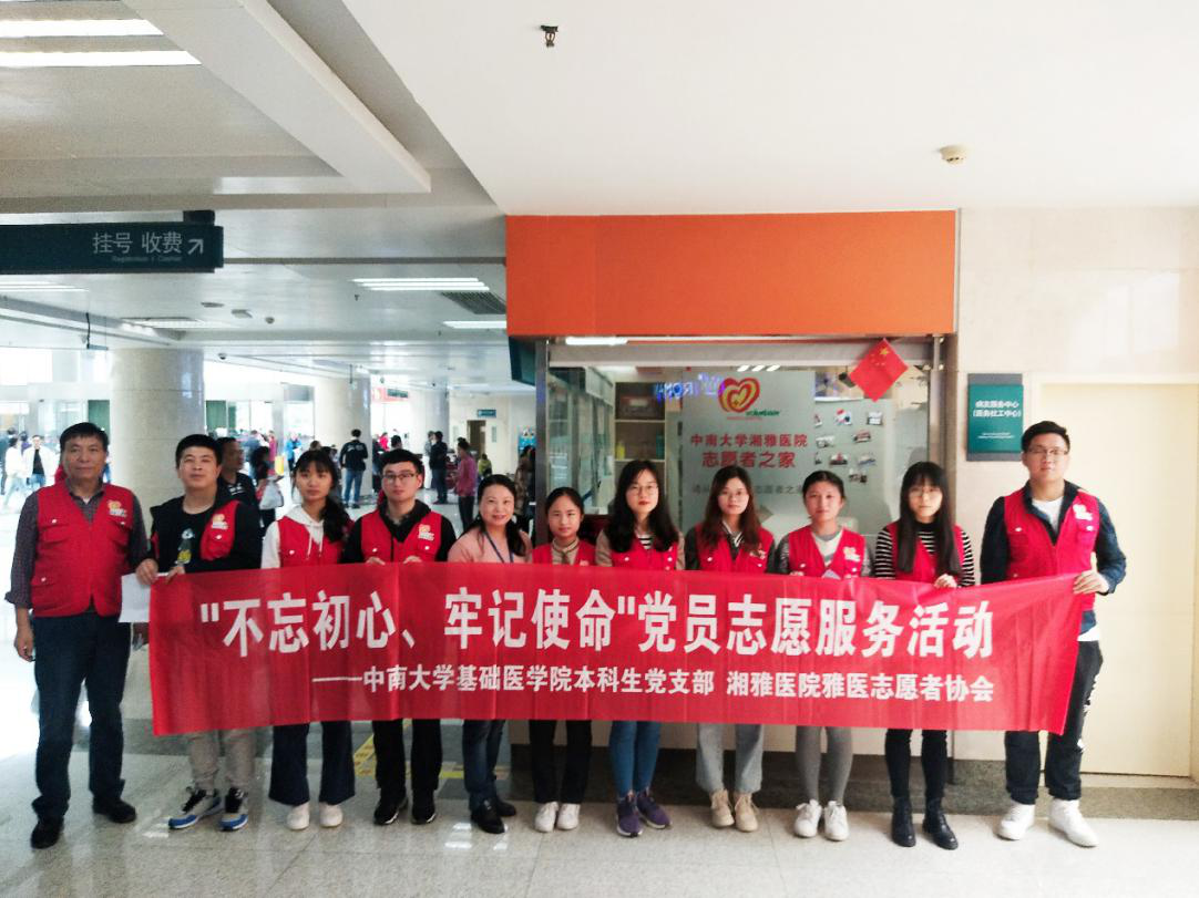 2019年10月24日、25日,基础医学院本科生党支部联合湘雅医院雅医志愿者协会,在肉漫屋 湘雅医院开展了“不忘初心、牢记使命”党员志愿服务活动,支部共有18名党员分两批次参加了此次活动。