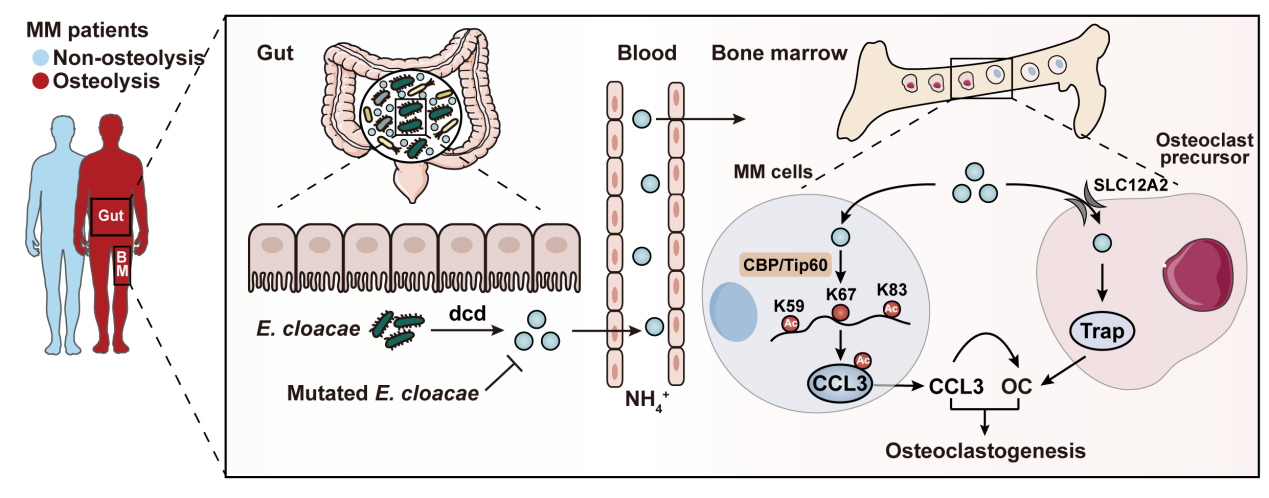 多发性骨髓瘤(Multiple Myeloma,MM)是一种常见于中老年人血液系统浆细胞恶性肿瘤,随着我国人口老龄化进程,MM的发病率呈明显上升趋势。骨病是MM的特征性表现之一,易导致骨相关事件,严重影响患者生存及生活质量。课题组前期研究发现弗氏柠檬酸杆菌为代表的肠道氮源循环微生物通过增加患者的NH4+水平、提高MM细胞对NH4+的摄入,从而诱导MM对硼替佐米耐药(Cell Metabolism 2024)。在前期研究基础上,本研究利用宏基因组学发现以E. cloacae为代表的肠道氮源循环菌在MM骨质破坏患者体内显著富集。进一步在5TGM1 MM小鼠模型中,通过粪菌移植及单菌移植实验,发现肠道E. cloacae通过增加循环NH4+水平以促进MM骨质破坏。在机制上,研究者发现,升高的NH4+一方面增加破骨前体细胞Trap蛋白水平表达,另一方面促进MM细胞CCL3蛋白乙酰化调控,共同促进破骨细胞分化,从而加重MM骨质破坏程度。最后,构建脱氨酶基因缺失的E. cloacae细菌系、使用益生菌以减少NH4+合成,能够缓解MM骨质破坏。以上研究结果建立了肠道E. cloacae及其代谢产物NH4+作为MM骨质破坏发病新机制和潜在干预策略。