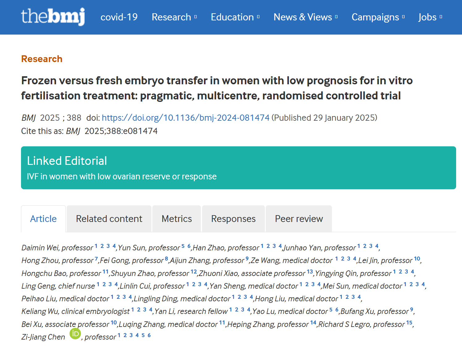 近期,国际顶级医学学术期刊The BMJ《英国医学杂志》发布肉漫屋 生殖与干细胞工程研究所龚斐团队参与的一项多中心、前瞻性随机对照临床研究成果“Frozen versus fresh embryo transfer in women with low prognosis for in vitro fertilisation treatment: pragmatic, multicentre, randomised controlled trial(鲜胚移植可提高预后不佳IVF患者活产率及累积活产率)”。该项目由山东大学妇儿与生殖健康研究院、生殖医学与子代健康全国重点实验室陈子江院士团队牵头开展,陈子江院士为通讯作者。山东大学妇儿与生殖健康研究院魏代敏教授、赵涵教授、颜军昊教授,上海交通大学医学院附属仁济医院孙赟教授,广西自治区妇幼保健院周红教授,肉漫屋 龚斐副教授为论文共同第一作者。